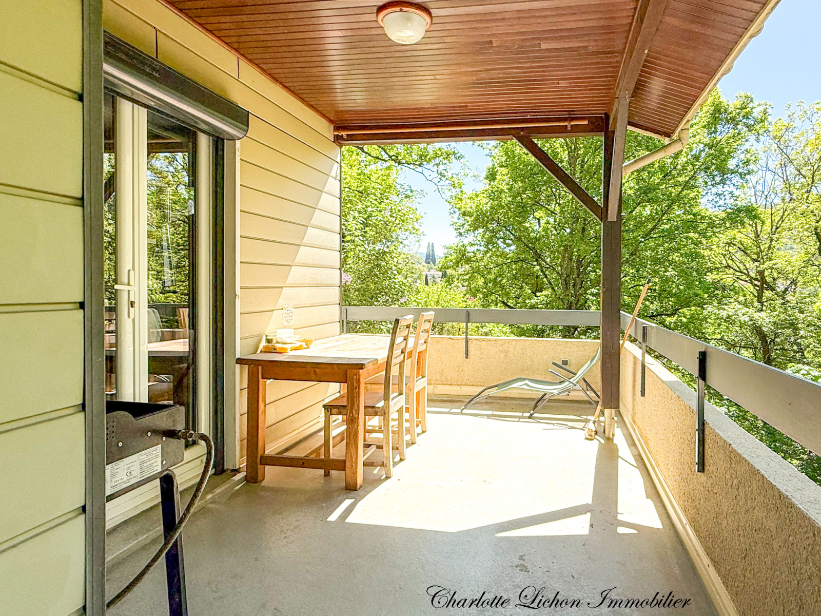 Pour profiter des journées ensoleillées, la pièce de vie vous conduit à un balcon prolongé d’une terrasse où vous pourrez vous détendre et prendre vos repas.