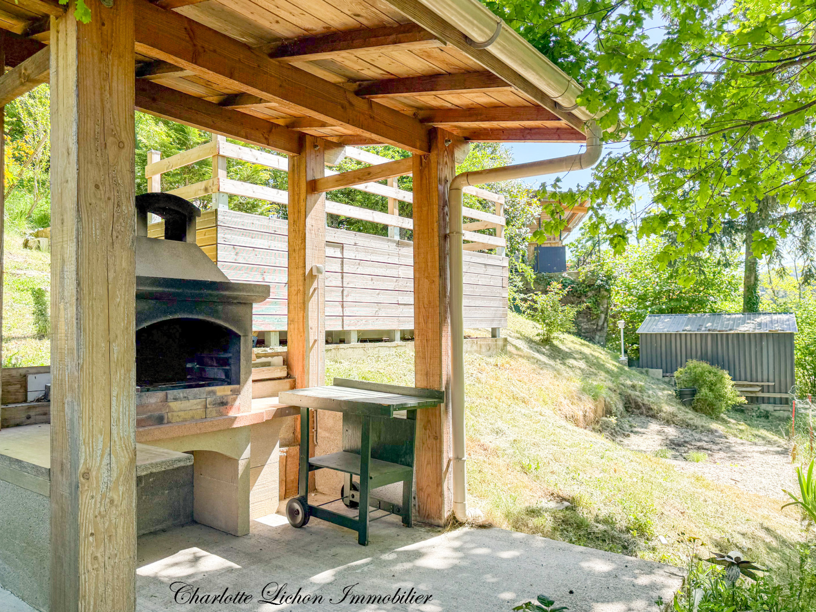 En extérieur, (terrain de 923 m2) vous apprécierez également l’espace barbecue, le coin piscine (piscine hors-sol à l’abri des regards) et la vaste étendue de verdure qui s’offre à vous.