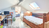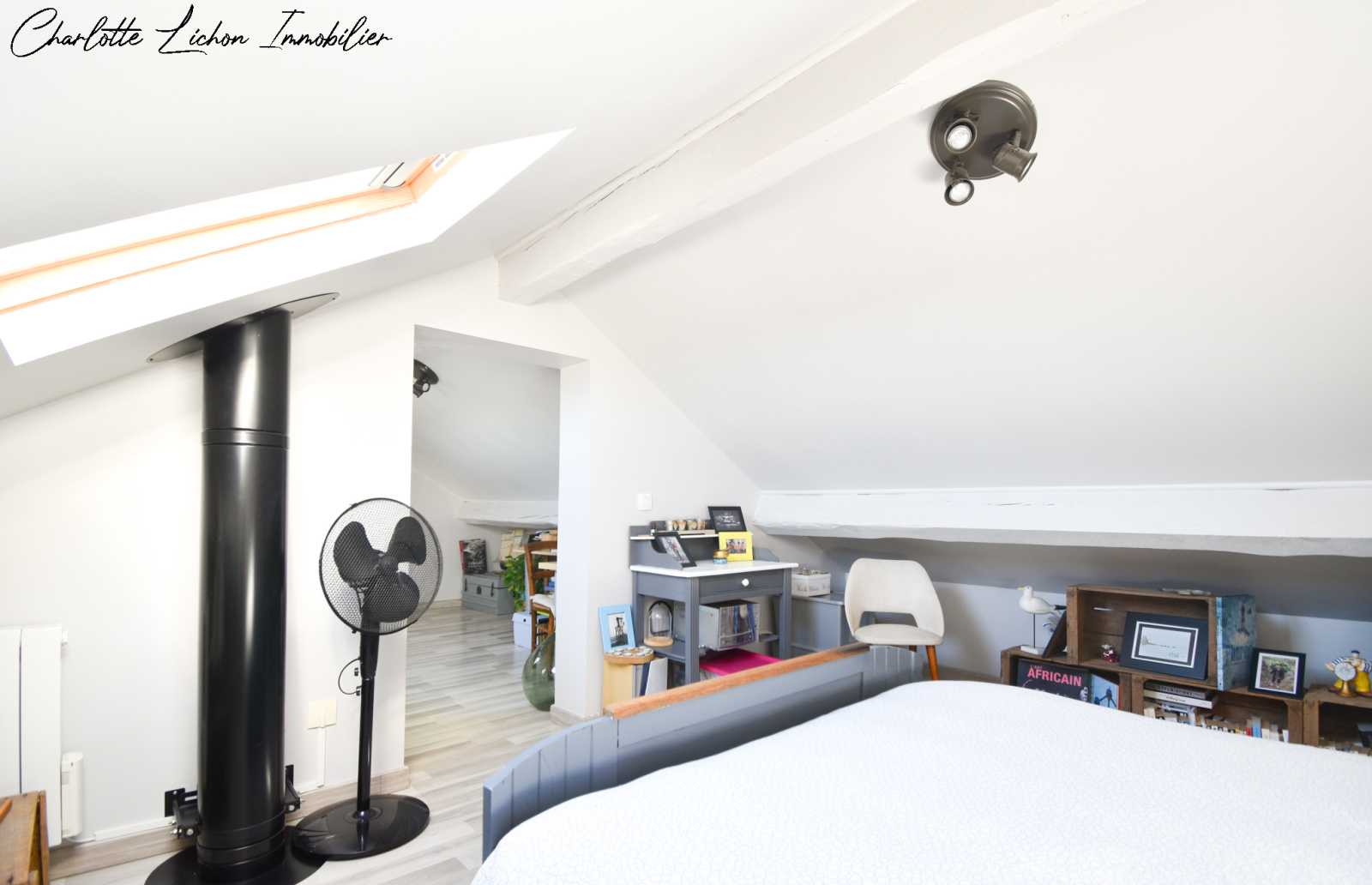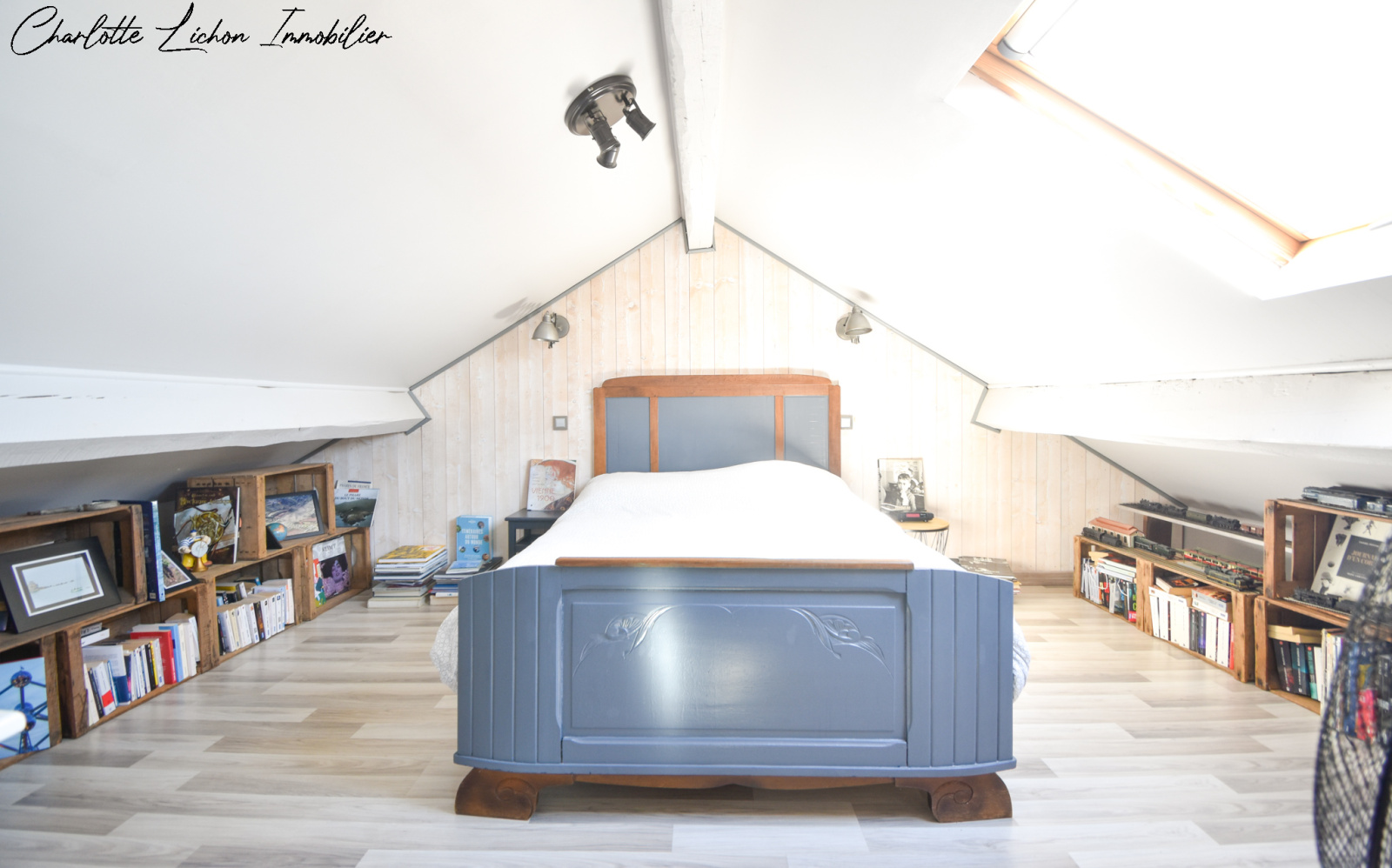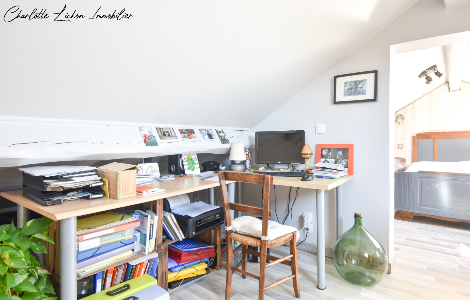 A l’étage, vous découvrirez, sous pente, un espace de 31 m2 au sol comprenant actuellement une partie bureau avec lit d’appoint et une chambre indépendante en enfilade.