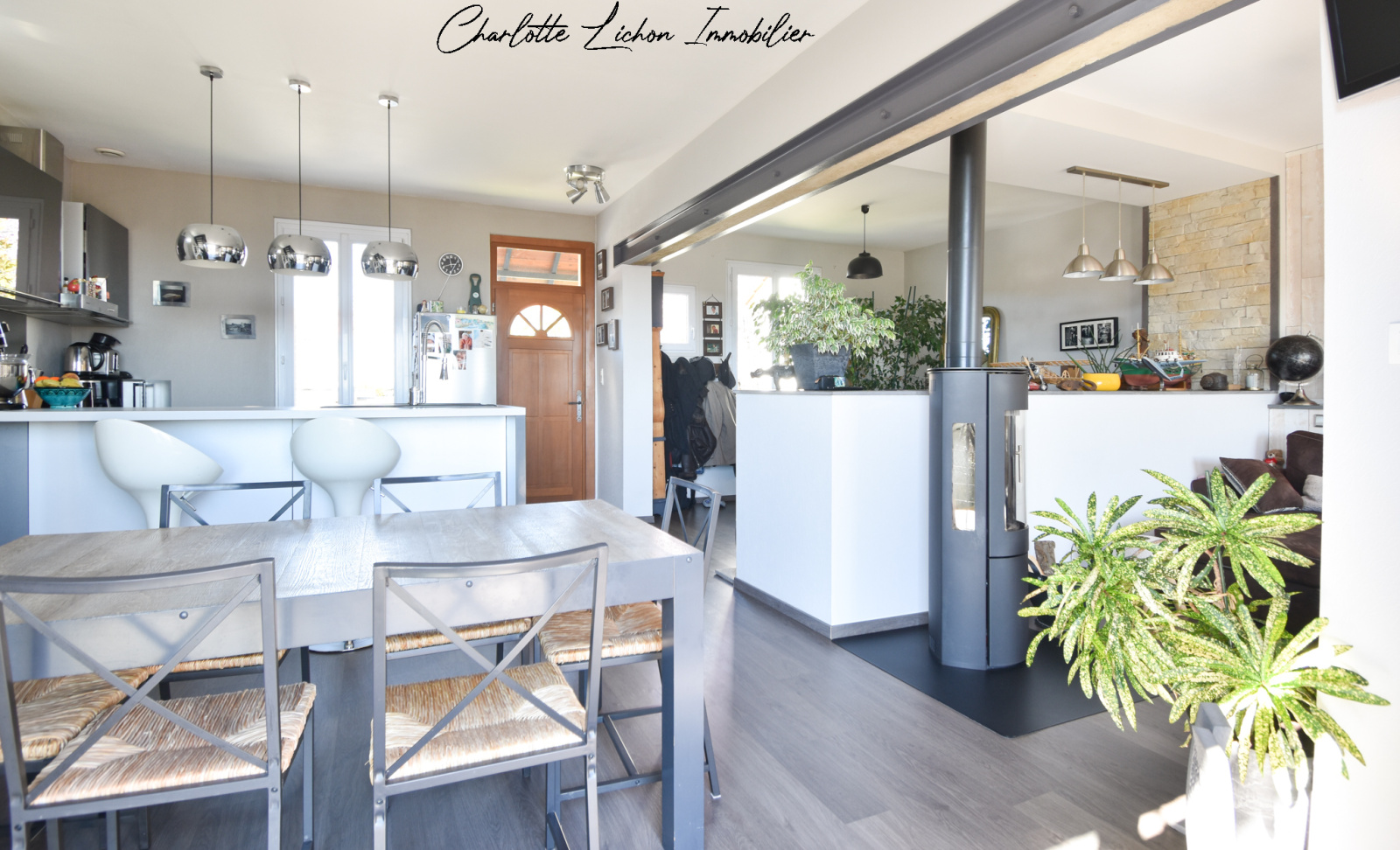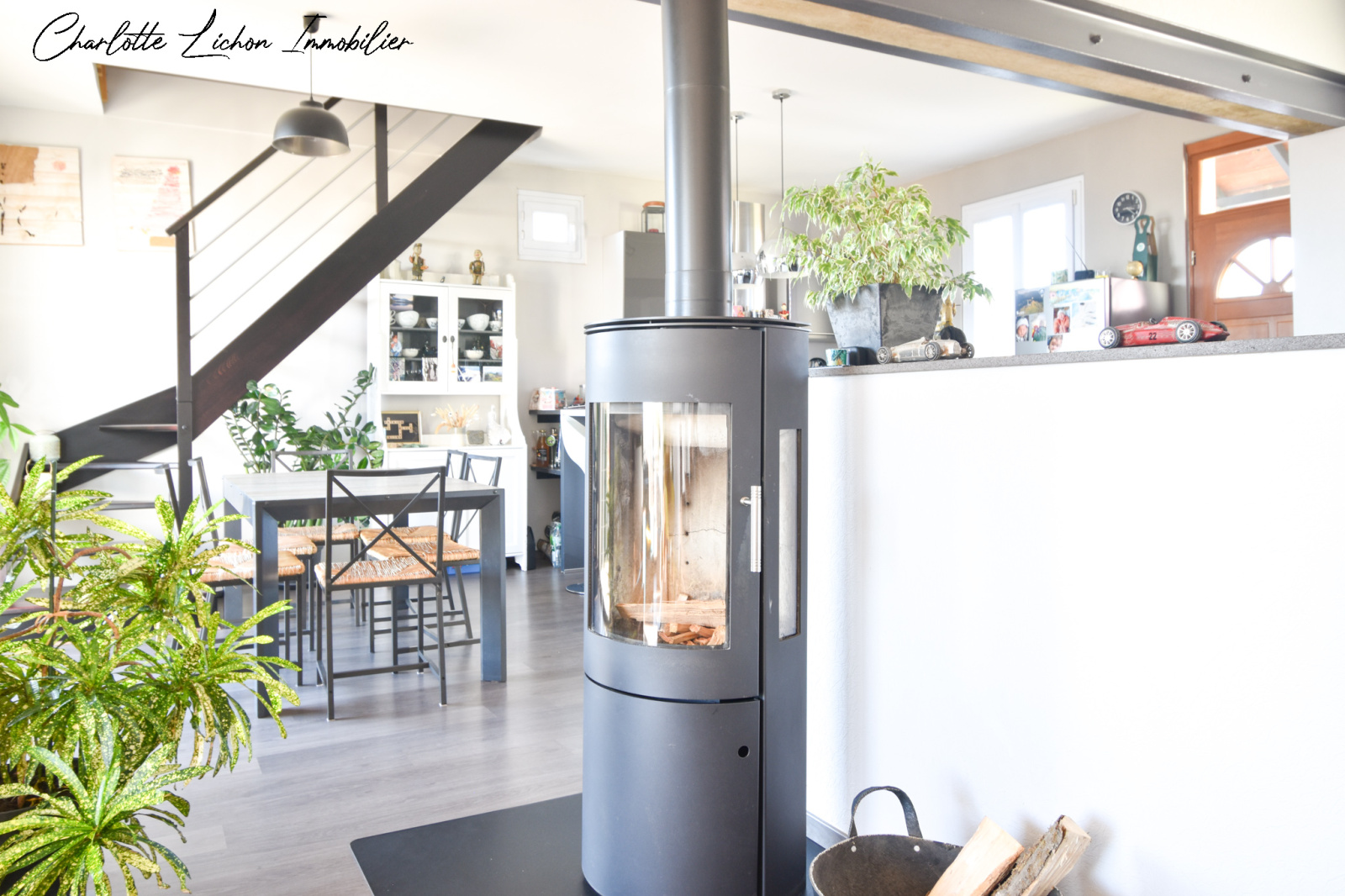 L’agence apprécie particulièrement l’espace détente créé avec un poêle à bois, la vue dégagée qui s’offre à vous et la luminosité apportée par les différentes fenêtres et la baie vitrée.