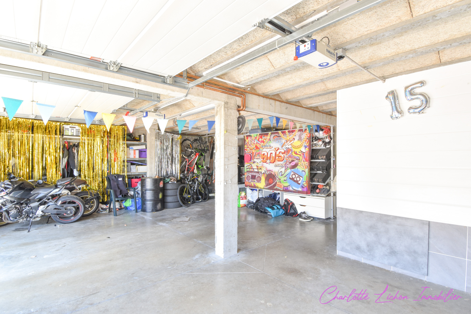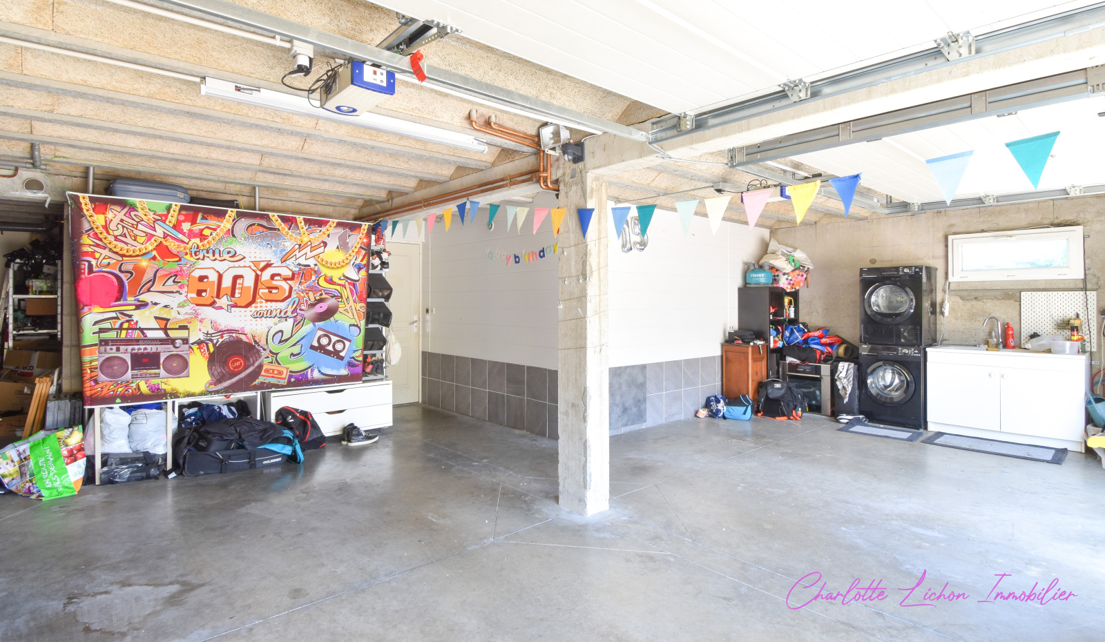 Garage double motorisé, vous pourrez entreposer vos véhicules grâce à une surface de 52 m2 (16 m2 sur la partie droite et 36 m2 sur la partie gauche). Un coin buanderie avec point d’eau a également été créé.