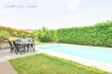 Sur l’arrière de la maison se trouve une terrasse semi abritée ainsi qu’une piscine enterrée chauffée grâce à une pompe à chaleur.