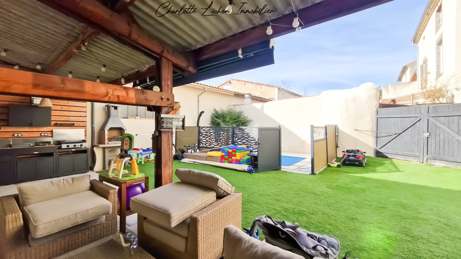 Côté extérieur désormais (227 m2), l’espace a été optimisé pour offrir une piscine enterrée sécurisée et une spacieuse terrasse avec cuisine d’été.