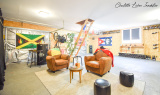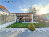 Dans le prolongement de la cuisine se trouve un garage double de 58 m2 avec buanderie, chaufferie et toilettes, une véranda de 24 m2 avec vue sur le jardin et une chambre en mezzanine de 30 m2.